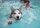 夏、元気一杯に水遊びする人と動物たち